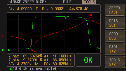 ZX70A/ZX80A系列超聲阻抗分析儀在儀器上就實現掃描圖形,還可以把儀器上屏幕顯示圖形和測試數據直接拷貝到U盤。同時儀器自帶電腦軟件界面,標配版無需另行購買。
