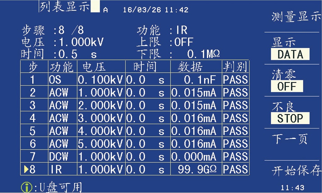 在多步測量時,傳統的耐壓儀往往只能看到當前的測試結果, 客戶無法查看前面幾步的測試結果。ZX9501系列耐壓儀具有列表掃描顯示功能,客戶可以很方便地查看各步的測試結果,也可以很方便地比較被測件在不同測試條件下的測試結果。